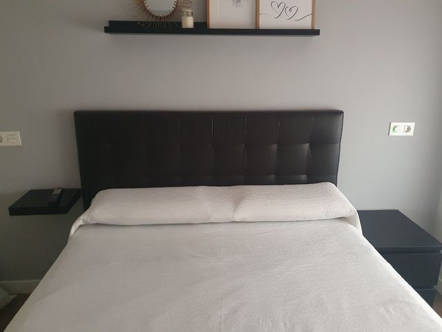 Conjunto habitación compusto por cabecero de polipiel, mesita y dos baldas. Color negro. De Ikea. Posibilidad vender por separado. Cabecero 160