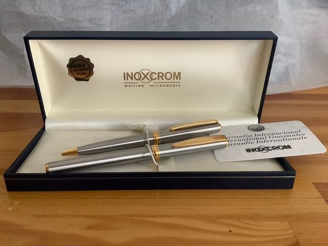 Detalles del productoElegante conjunto de escritura Inoxcrom, compuesto por una pluma y un bolígrafo.