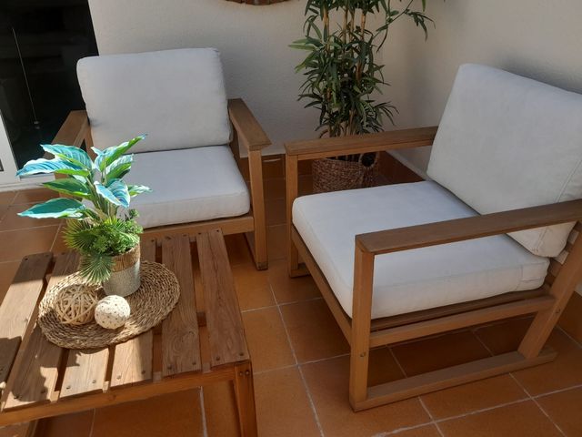 Detalles del productoConjunto de jardín compuesto por dos sillones y una mesa de madera de eucaliptos. Perfectos para disfrutar del buen tiempo. Son de madera y tienen cojines de tela todo del IKEA, en las ulimas tres fotos de ve modelo y precio de nuevo. Ideales para terrazas o patios. - Dos sillones con cojines beige. - Mesa de madera con diseño rústico. - Estructura robusta y elegante.