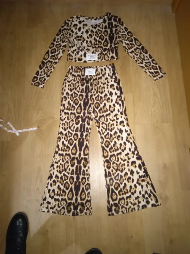 Conjunto de dos piezas con estampado de leopardo. De Shein - Crop top de manga larga. - Pantalón de campana. De licra suave que cede. Largo del pantalón 80cm
