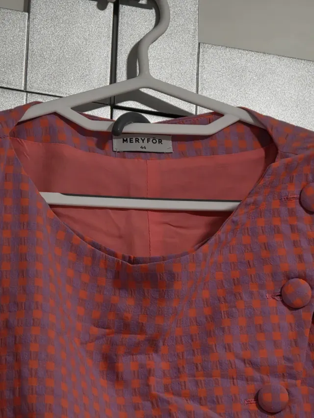 Conjunto de la marca Meryfor. - Talla 44. - Diseño a cuadros en tonos morado y naranja. - Detalle de botones forrados. Y cruzado 250 euros su precio