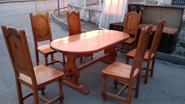 Detalles del productoConjunto de mesa de comedor grande con seis sillas a juego, todo fabricado en madera de pino.