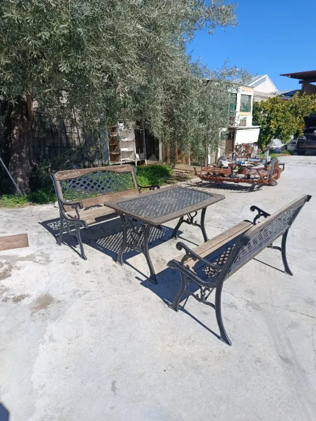 Conjunto mesa y bancos forja jardín.