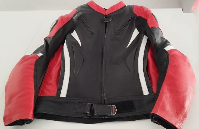 - Chaqueta de cuero negra y roja con detalles blancos.