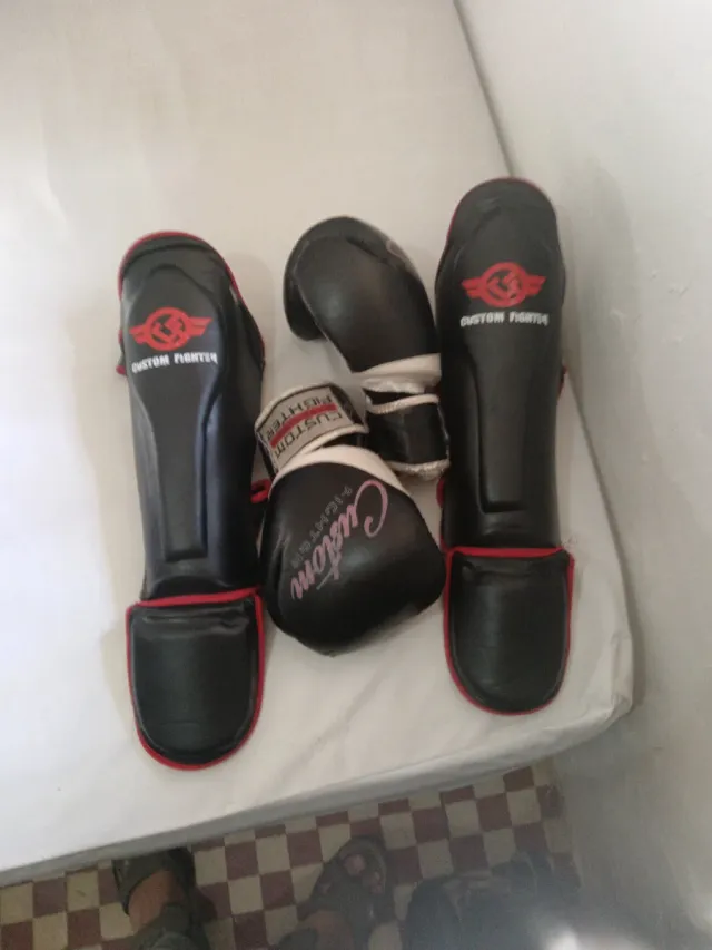 - Guantes de boxeo negros con detalles rojos.