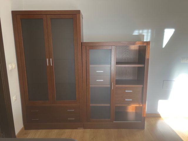 Detalles del productoConjunto de mueble de salón. 1 Vitrina con puertas abatibles y otra con puerta corredera. El mueble de televisión cuenta con 1 desgaste en el lado. Incluye 2 baldas para encima del mueble del televisor. Tambien se puede vender por separado.