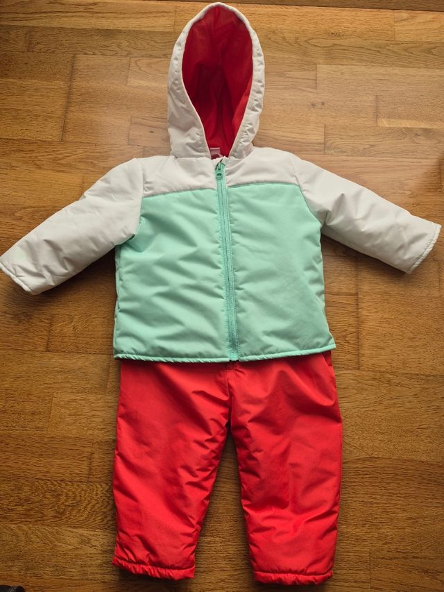 Detalles del productoConjunto de nieve infantil, válido tanto para niña o niño. Compuesto por mono de tirantes en color rojo y chaqueta en blanco y verde menta con forro interior rojo. Talla 18 meses. Puesto únicamente 1 vez, en perfecto estado.