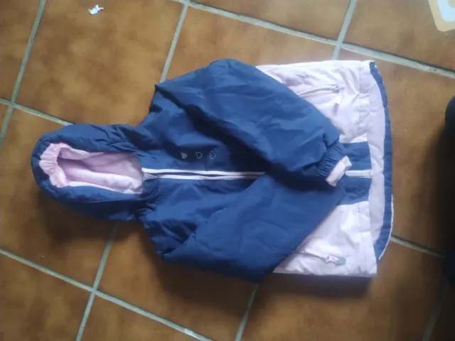 Conjunto de ropa de nieve para niña, talla 110/116. Incluye cazadora y mono. - Cazadora azul con detalles en rosa. - Mono de nieve a juego.