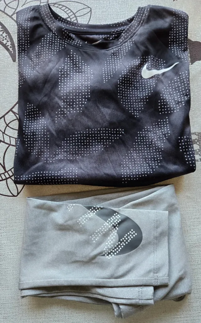 - Camiseta negra con estampado de puntos blancos y nudo bonito en la parte inferior central.