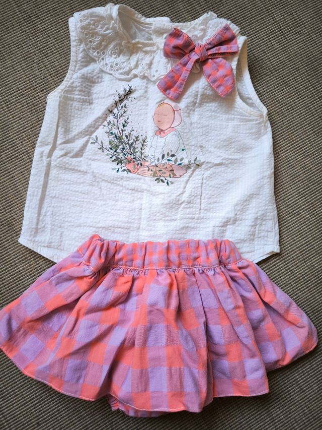 Detalles del productoPrecioso conjunto marca Valentina para niña de 24 meses. La camisa es blanca, de algodón, con un bonito cuello de encaje y un lazo a juego. La ranita es a juego, de cuadros rosas y morados. Está en perfecto estado. - Incluye camisa y ranita. - Talla 24 meses. - Algodón. - Diseño delicado y elegante.