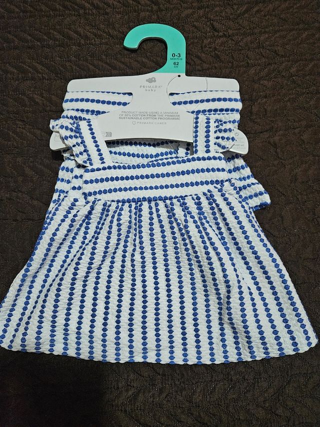 Detalles del productoPrecioso conjunto de dos piezas para bebé niña de Primark. El conjunto incluye un vestido y una braga a juego. Ambos están confeccionados en un tejido suave y agradable al tacto con rayas azules y blancas. - Ideal para primavera/verano. - Talla 0-3 meses