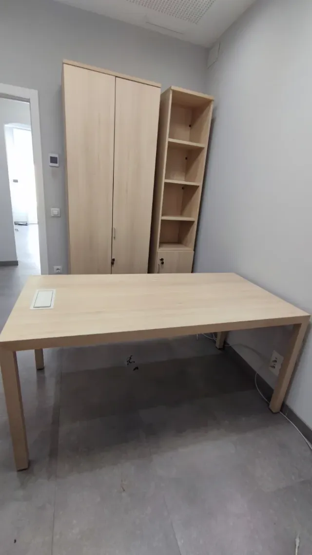 Conjunto de mobiliario de oficina que incluye un escritorio y dos estanterías.