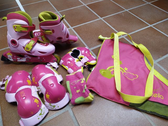 Detalles del productoPatines en línea ajustables de la talla 28 a la 30. Marca OXELO todo el conjunto. Patines, protecciones, calcetines y bolsa transporte incluido. Todo el buen estado. Medidas del producto
