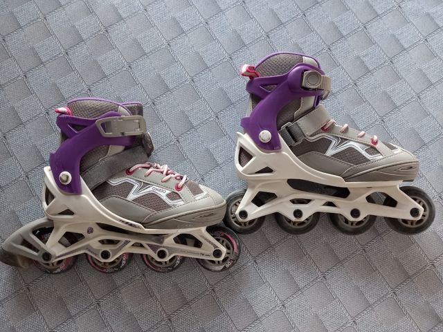 Detalles del productoPatines en línea. Talla 32-35. Hasta 60 Kg. El patín crece con el pie ajustándose a la talla correcta. Ruedas y freno de goma (que se conserva muy entero). Casco blanco con stickers. Talla 50-54 cm. Las protecciones se encuentran rozadas pero siguen teniendo "cuerpo". Vienen en su bolsa de rejilla. Bolsa para transportar todo el conjunto. Todo de la marca Oxelo (Decathlon).