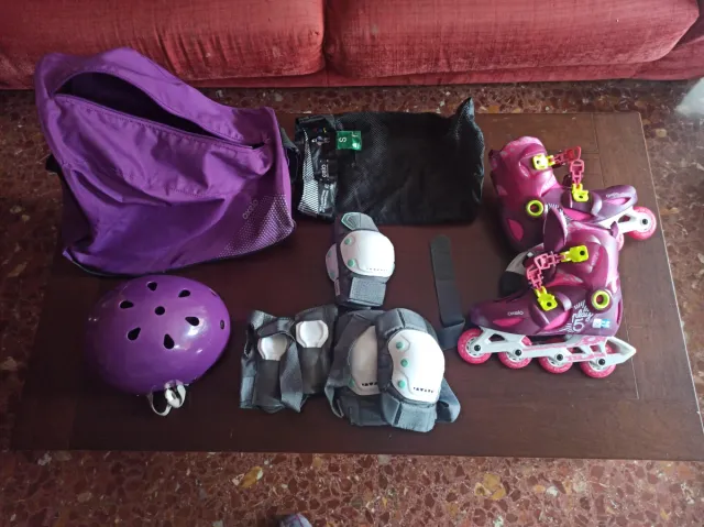 Detalles del productoConjunto de patines Oxelo Play 5 en color rosa y morado, ideal para iniciarse. Incluye patines, casco y protecciones.