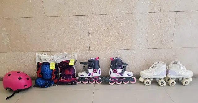 Detalles del productoConjunto de patines en línea y protecciones de la marca Oxelo.