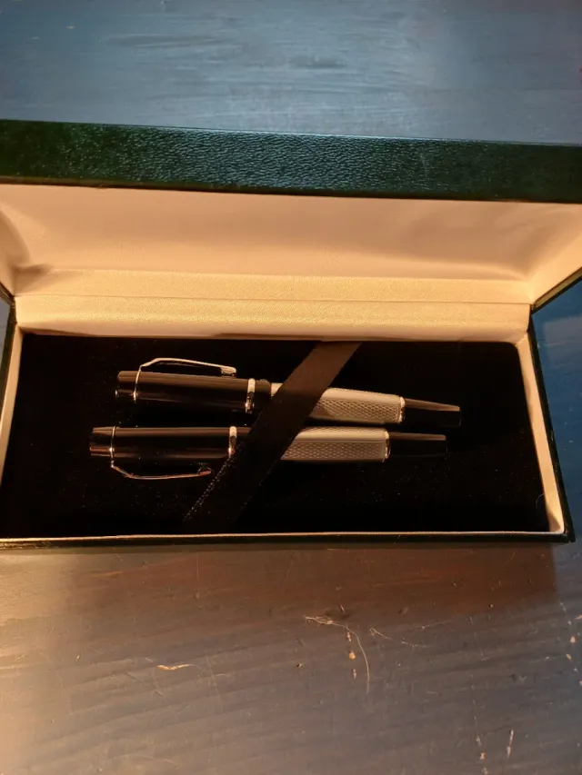 Detalles del productoElegante conjunto de escritura que incluye una pluma estilográfica y un bolígrafo.