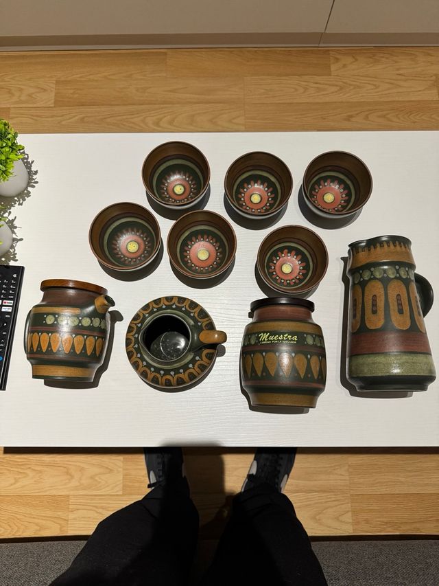 Detalles del productoConjunto de cerámica artesanal de Porta Celi, España. Piezas con un diseño único y colores vibrantes.