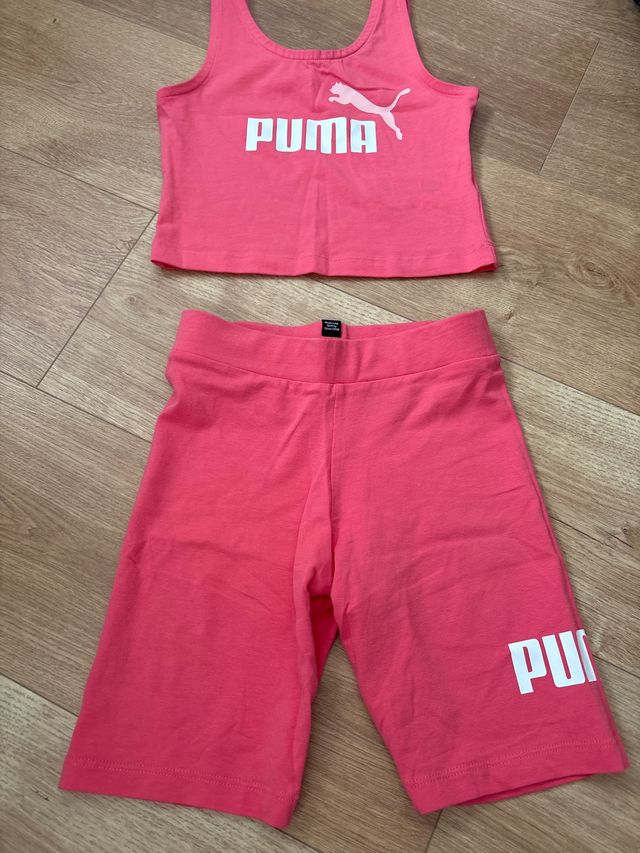 Conjunto deportivo Puma de dos piezas en color rosa. - Top sin mangas con logo Puma. - Shorts tipo ciclista con logo Puma.