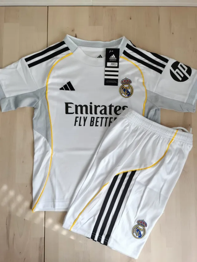 Conjunto deportivo del Real Madrid. - Tallas disponibles: 5-6 años y 9-10 años. - Incluye camiseta y pantalón corto. - Diseño oficial del equipo.