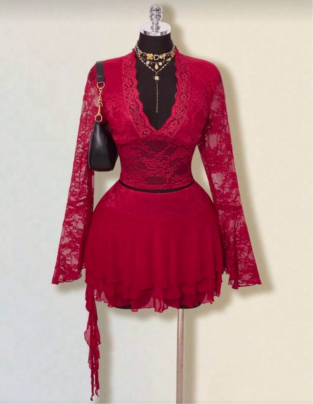 Conjunto rojo encaje manga larga