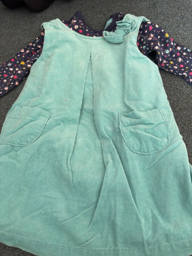 Conjunto de dos piezas para bebé. - Vestido de pana color verde menta. - Body Manga larga estampada con flores.