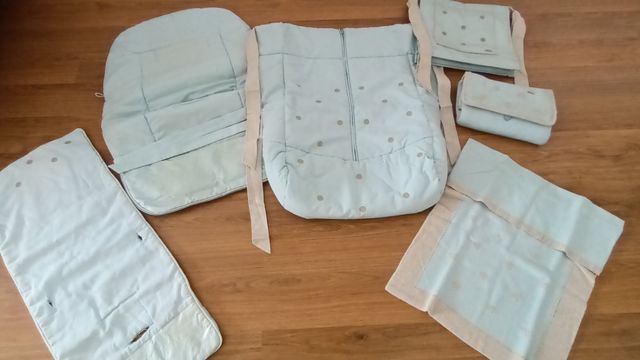 Detalles del productoIncluye saco para capazo, saco para silla de carro y silleta de paseo, bolso, cambiador y toalla. El cambiadory la toalla tienen manchas amarillas de estar guardado
