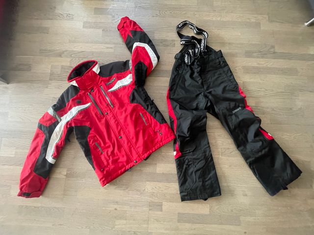 - Pantalón de color negro con detalles en rojo y tirantes, talla S equivalente a una 48.