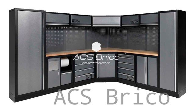 Detalles del productoCONJUNTO TALLER MODULAR CON ESQUINERO DE 7 MODULOS CON BASE DE TRABAJO DE ACERO INOXIDABLE ALYCO