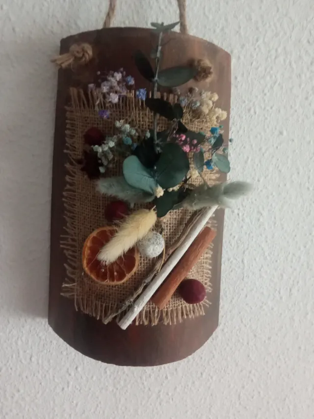 - La otra teja presenta un arreglo floral con hojas verdes, flores secas, rodajas de naranja. 8 euros cada una