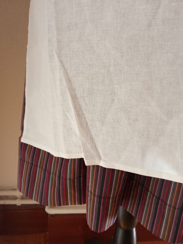 Detalles del productoConjunto vasco rayas neska infantil y adulto. Falda raya distintos colores a juego con camisa lino puntilla. Pañuelo. Personalizable, a elegir delantal, o toquilla. Precio: 75€