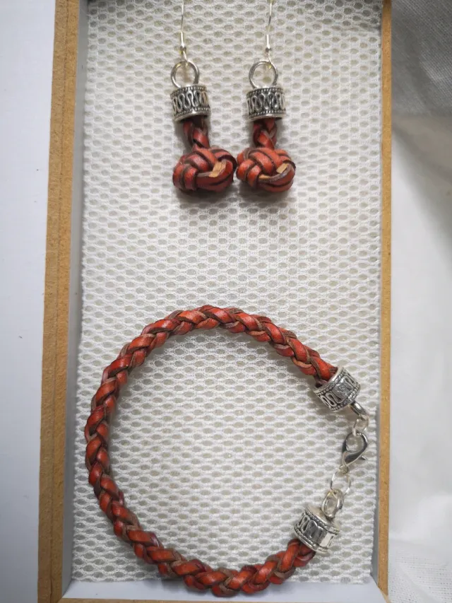 Conjunto de Pulsera y Pendientes de Piel Trenzados
