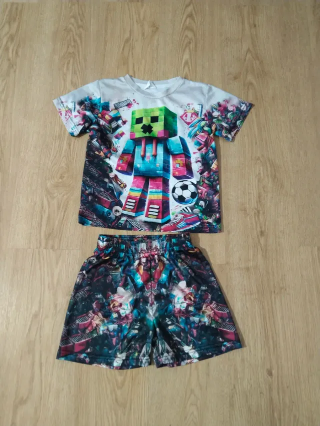 Detalles del productoConjunto de camiseta y pantalón corto con un estampado vibrante inspirado en Minecraft. Ideal para los fans del juego.