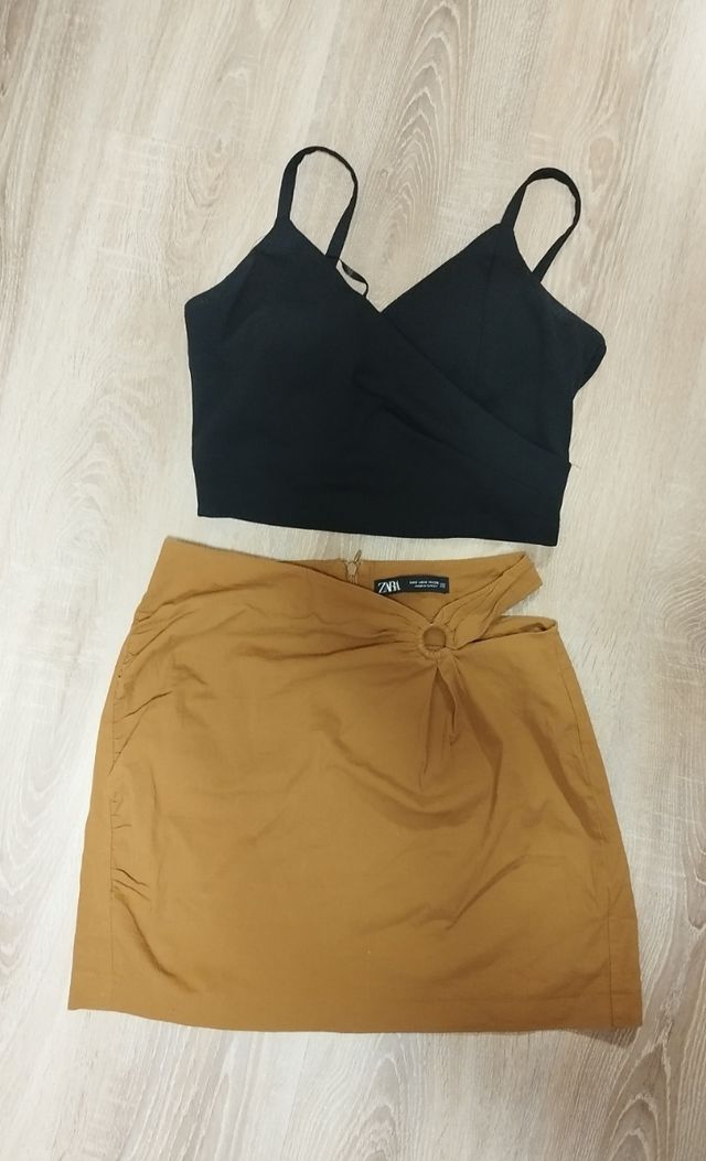 Conjunto Zara Top Negro y Falda Marrón Talla S