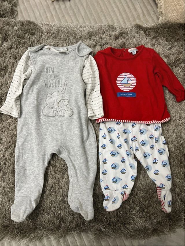 Detalles del productoconjuntos de bebe de 1 a 6 meses en muy buen estado uno es de tercio pelo, que es el que es tipo monito lleva sus botones para cambiar con facilidad el pañal y su camiseta de algodon y el otro es un conjunto se polaina y camiseta finita de algodon super comodos los dos la marca es pillerias