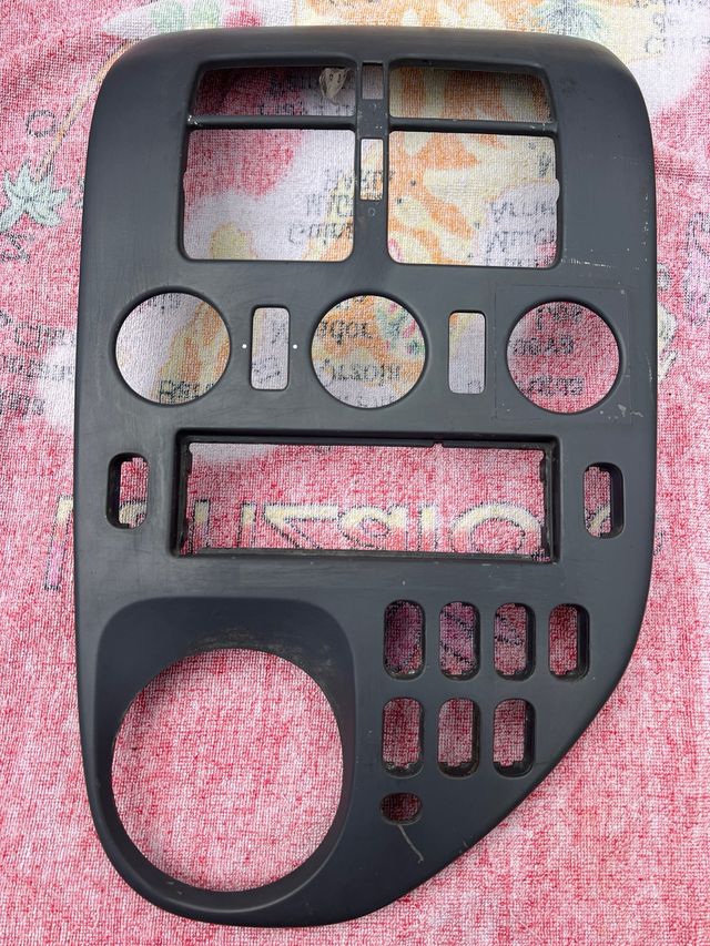 - No está perfecta. Los enganches principales están bien. Solamente le faltan donde va la radio (están marcados en rojo en las fotos). Los 2 orificios que van donde la radio y otro encima que sujeta la consola al salpicadero. Nada que con un poco de bricolaje se pueda arreglar.