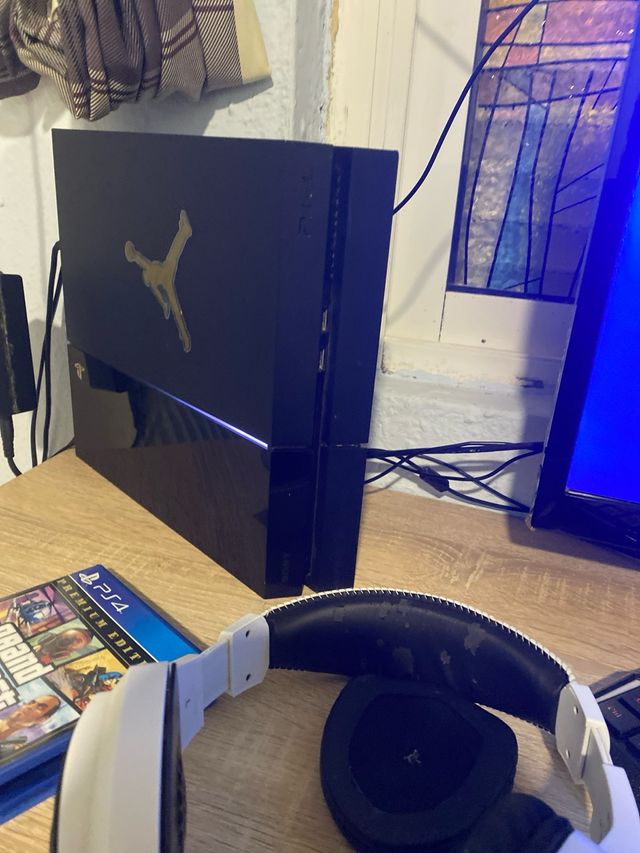 Detalles del productoConsola PlayStation 4 en color negro con un distintivo logo de Jordan viene con todos los cables el mando tambien viene con el fifa 22 y el gta 5