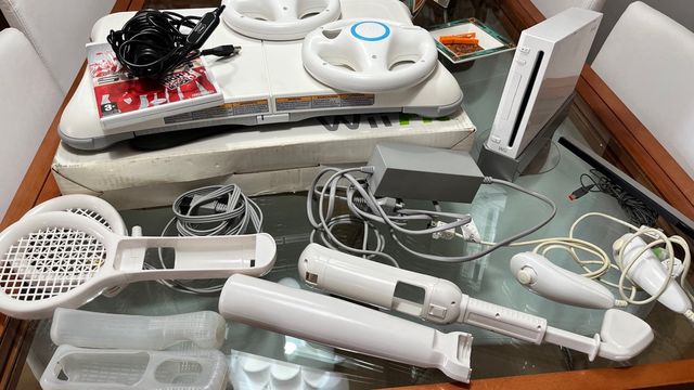 Detalles del productopack consola wii con muchos accesorios, fundas mandos, volantes , microfono, juego de cantar y la tabla wii fit.