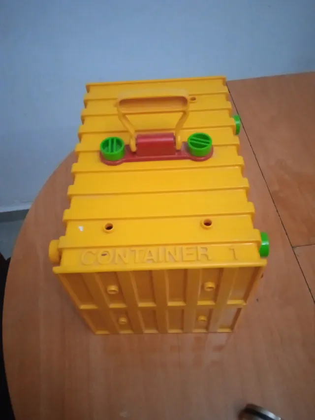 Contenedor de juguete de color amarillo brillante, con asa y detalles en rojo y verde. - Diseño tipo maleta. - Inscripción CONTAINER 1 en relieve.