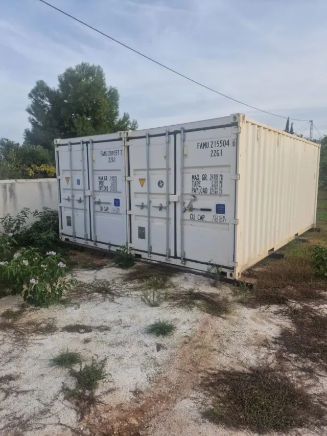 Contenedor marítimo de color blanco, ideal para almacenamiento o transporte. - Estructura robusta de metal. - Puertas de doble hoja.