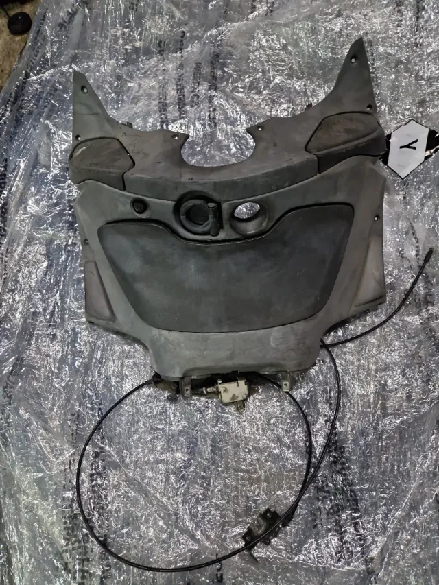 Contraescudo para Piaggio X9. Algo descolorido. Pestillo de la guantera para cambiar. - Pieza de plástico gris oscuro. - Incluye cables y mecanismo.
