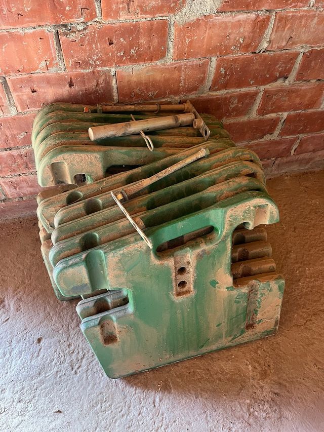 Detalles del productoContrapesos de tractor John Deere de 50 kg cada uno. Están fabricados en color verde y son ideales para añadir peso a la maquinaria agrícola.