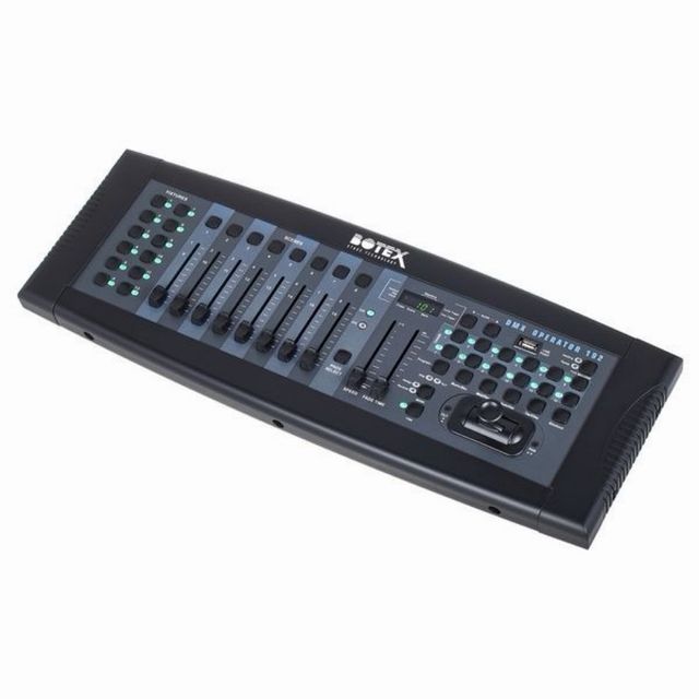 Controlador DMX Botex DC-192 para luces. - Diseño compacto y profesional. - Múltiples faders y botones para control. - Pantalla digital integrada.