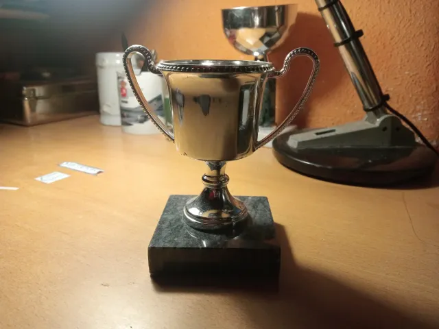 Trofeo de copa de fútbol estilo Champions League. Ideal para coleccionistas o como premio. - Diseño metálico plateado. - Base de mármol negro. - Asas decorativas.