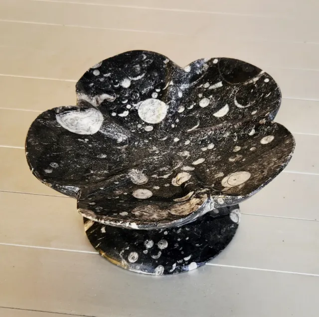 Detalles del productoElegante copa decorativa elaborada con piedra natural, que presenta fósiles de Orthoceras incrustados.