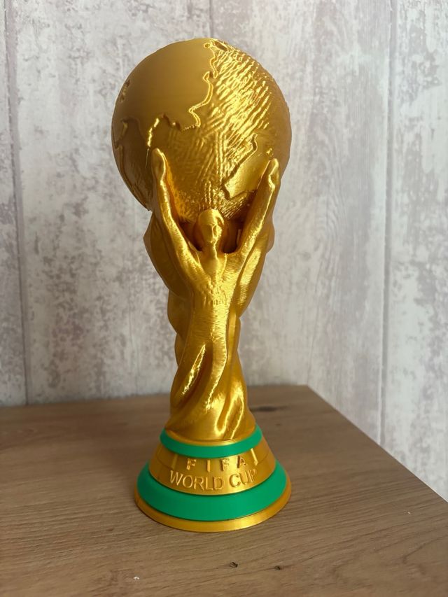 Detalles del productoRéplica del trofeo de la Copa Mundial de la FIFA. Un objeto decorativo con un acabado en color oro.