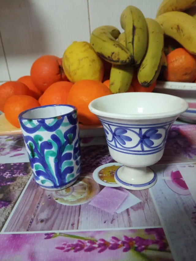 Copa y vaso de cerámica azul y blanco