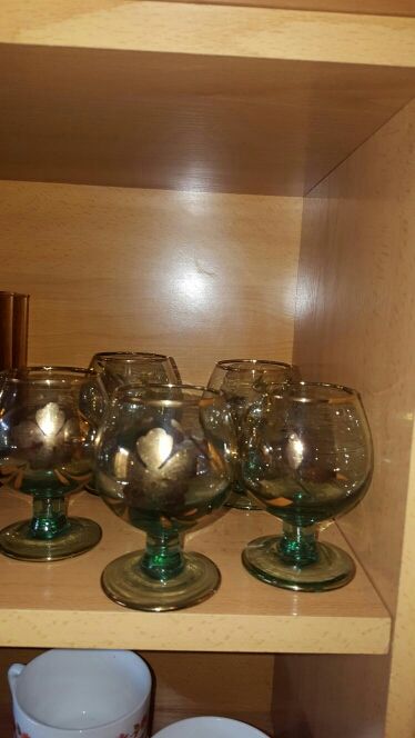 5 copas verdes y pintadas con detalles color oro. Vintage Años 60