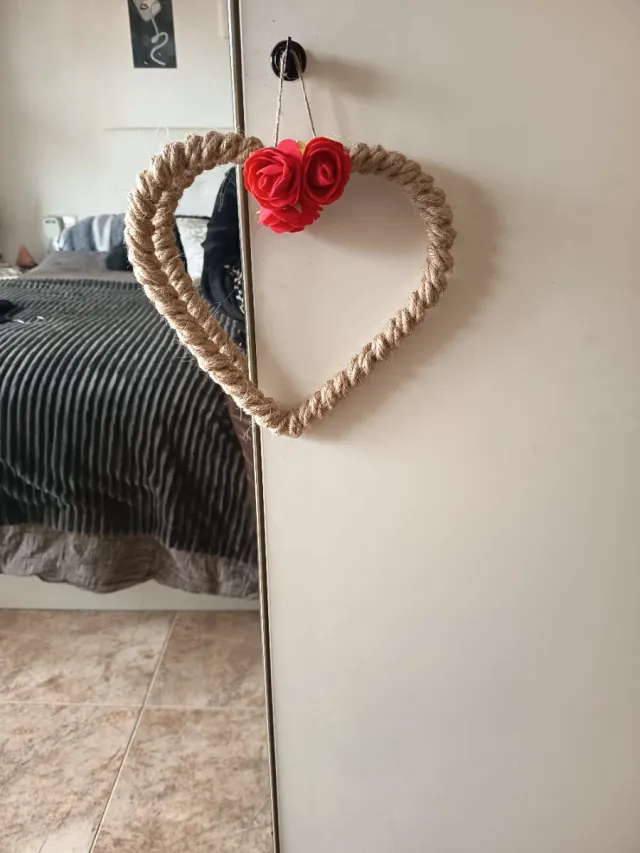 Corazón decorativo hecho a mano con cuerda, ideal para San Jordi. - Material: Cuerda. - Adornado con dos flores rojas.
