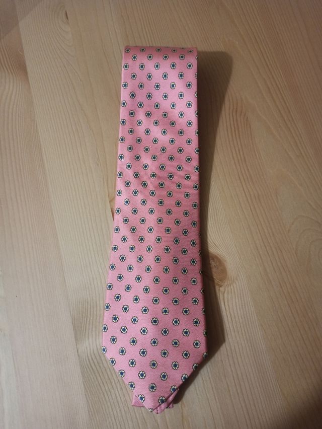 Corbata de seda de la marca inglesa JOHN CONFORT. Es de color rosa con dibujos de flores.